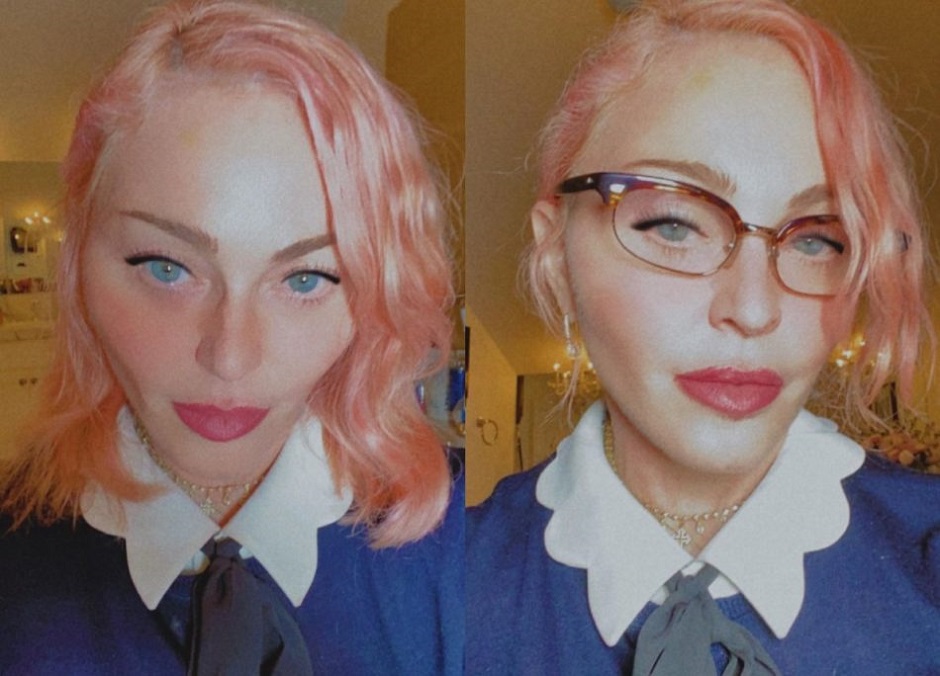 Con look preppy, colletto bianco su una blusa blu e occhiali dalla forma a gatto, Madonna è irriconoscibile sia per i suoi nuovi capelli rosa che per i tratti del viso alterati da un filtro o perché ha solo posizionato la telecamera in modo da rendere gli zigomi molto pronunciati.