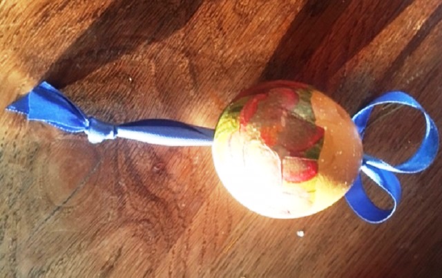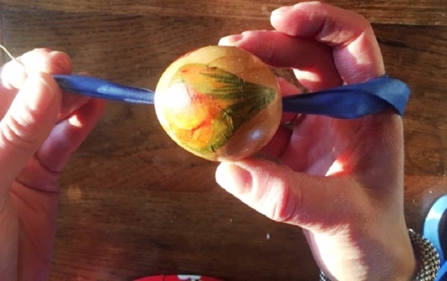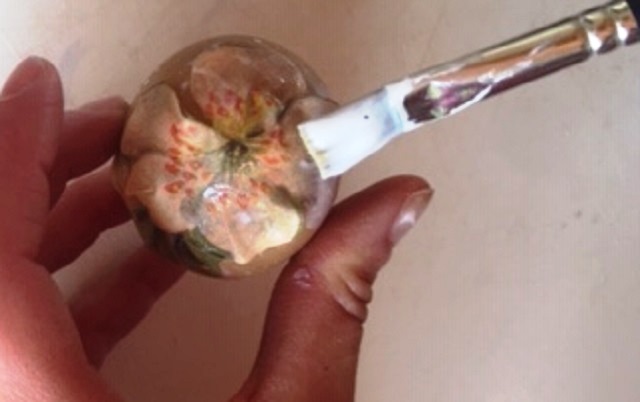 Applicate la decorazione sul vostro uovo e stendete la colla, in questo caso ho scelto un fiore come decorazione, sul fiore stesso con cura e senza danneggiarlo.