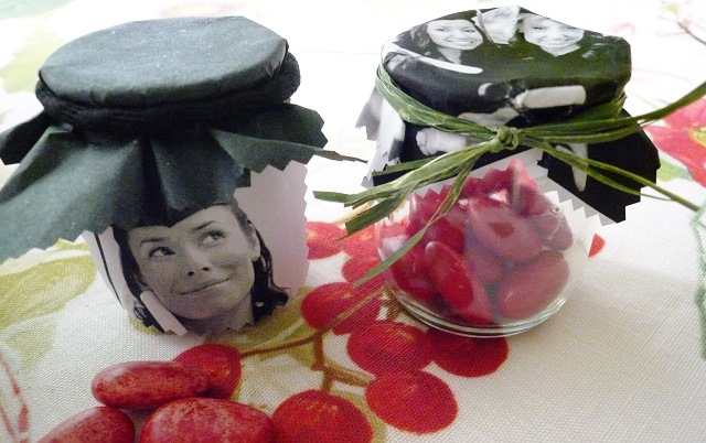 Prendi delle foto del soggetto interessato oppure delle immagini a tema e realizza i coperchi da 10X10 oppure delle etichette da incollare larghe 8 cm. e alte 4 cm.