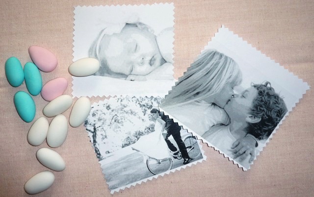 Step 2- Confetti colorati a tema, fotopie di fotografie del soggetto interessato in formato 10X10 cm. (basta stampare in sequenza la fotografia nel formato scelto e poi ritagliarla), forbici a taglio zig-zag, nastro colorato a rafia o di tessuto e colla vinilica.