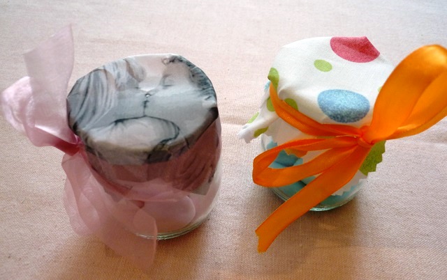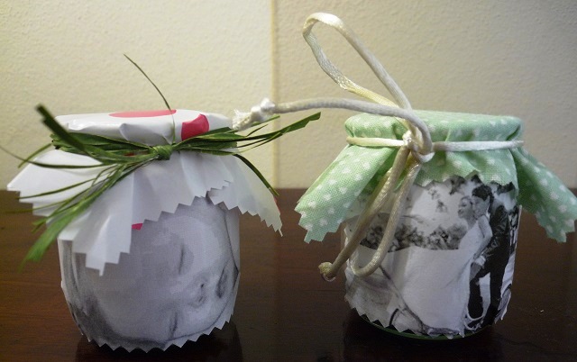 Dopo aver incollato le foto all’interno dei vasetti, attendi che la colla sia sciutta e confeziona la bomboniera con i materiali decorativi