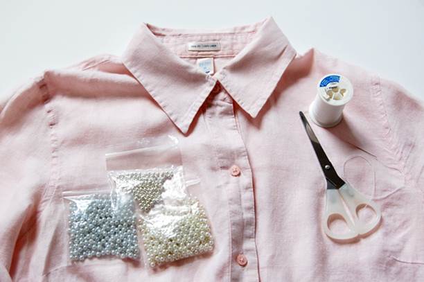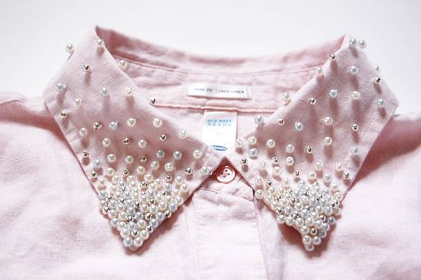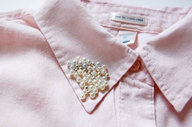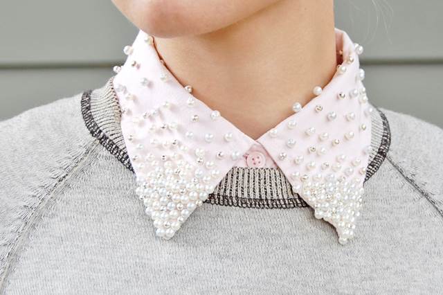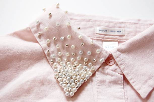 Per prima cosa distribuite le perle sul colletto della camicia per decidere quale schema seguire. Ad esempio, potete ricoprire completamente il colletto oppure solo la punta.