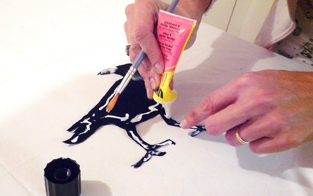 Stendi la colla per tessuti sui bordi delle 4 sagome di stoffa nera e usa un pennello per stenderla in modo omogeneo