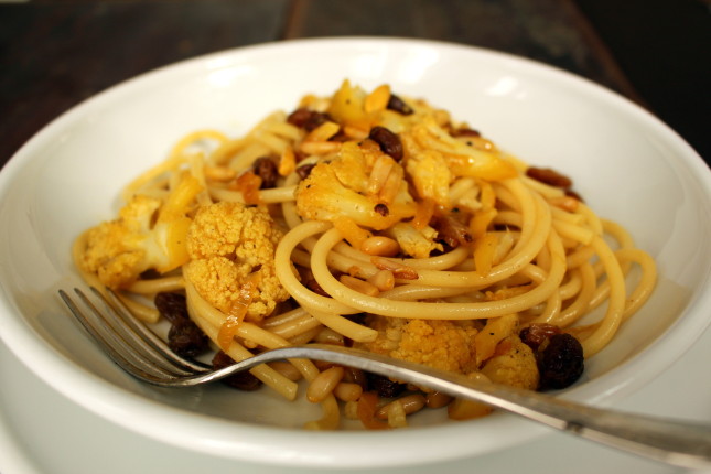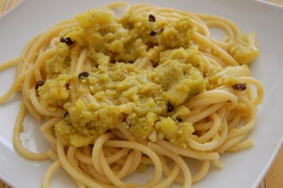 A questo punto, in una padella, rosolate la cipolla tagliata  in piccoli pezzi insieme all’aglio, quindi unitevi il broccolo sminuzzato, l’uvetta e i pinoli e cuocete  aggiungendo  una tazzina di acqua di cottura nella quale  avrete sciolto  una bustina di zafferano. Mescolate  spesso e se occorre aggiungete altri acqua di cottura, fino ad ottenere un condimento cremoso ed omogeneo. A questo punto salate , pepate e condite con un filo d’olio.