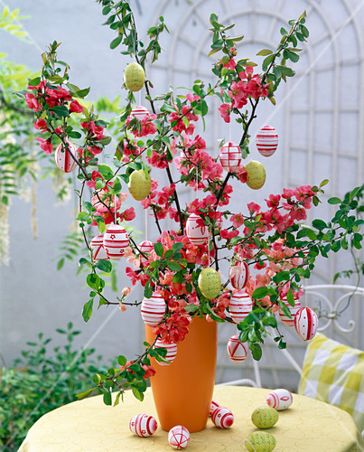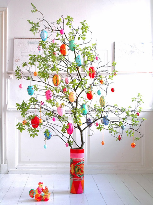 Ecco un esempio di albero pasquale decorato con le uova.