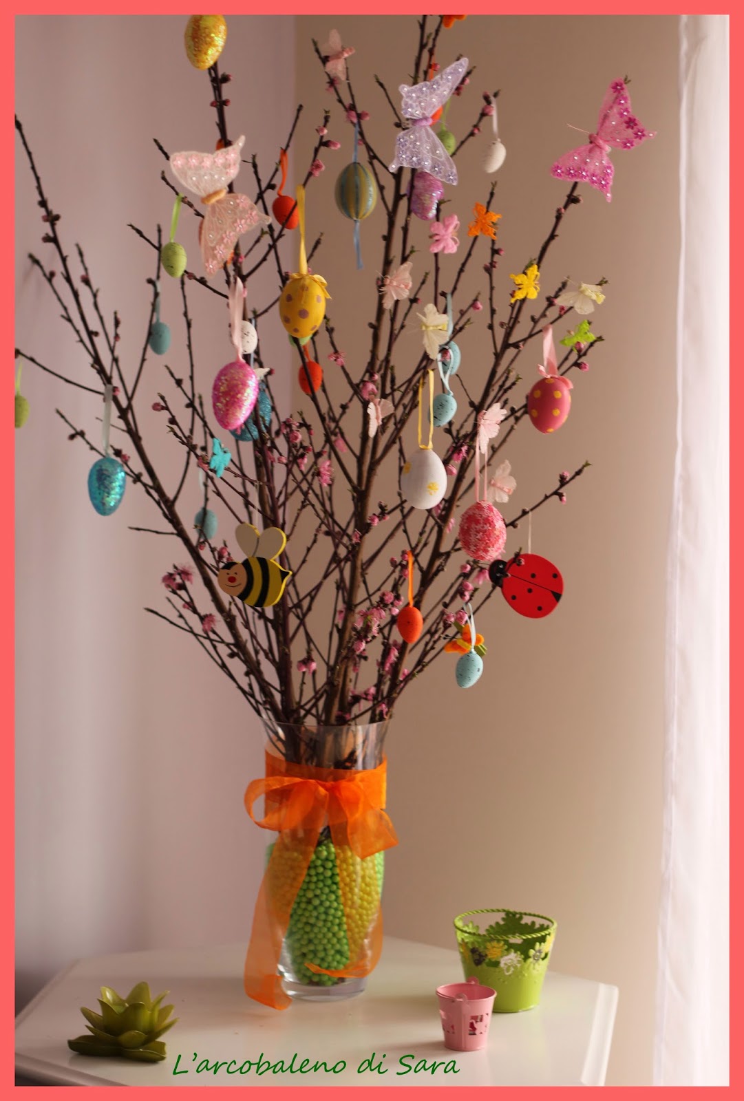 Potete realizzarlo anche con palline a forma di uovo, coniglietti, uccellini, fiori, etc e usare tutta la vostra creatività ed immaginazione. Il risultato sarà comunque un bello. Se avete a disposizione delle luci, inoltre, potete inserirle così la sera sarà illuminato.