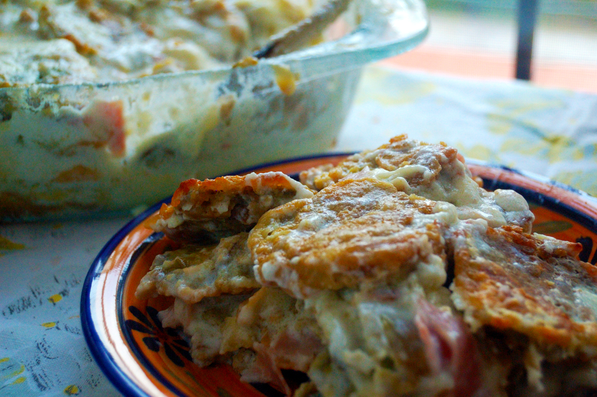 6. Continuate a creare gli strati fino a terminare gli ingredienti e ultimate con uno strato di pan grattato per creare una bella crosta gratin in superficie: per farla perfetta mettete il formaggio tipo sottiletta, il parmigiano, il provolone e il pan grattato