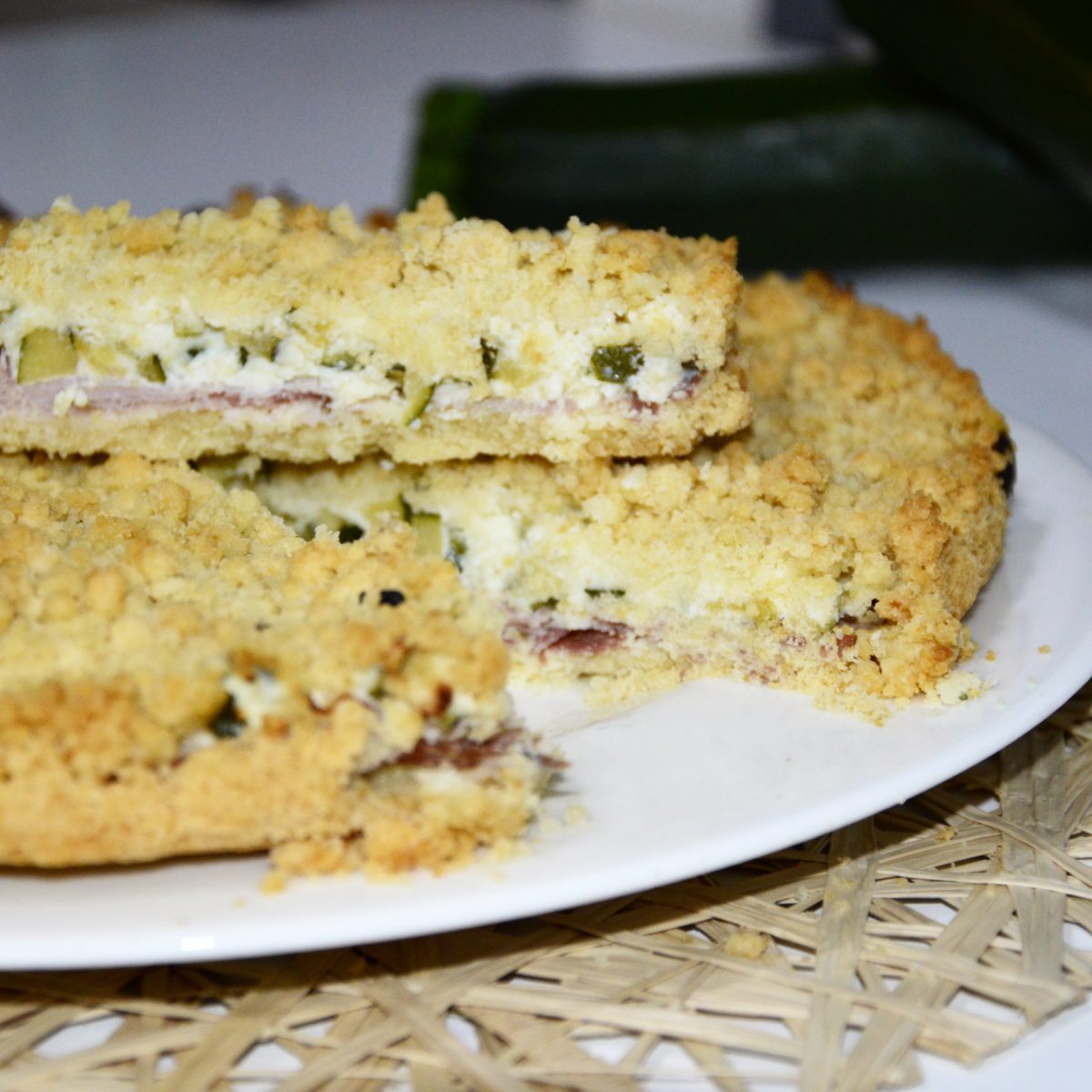 Ingredienti per il crumble, 300 gr di farina 00, 130 gr di burro, 20 gr di parmigiano grattugiato, 1 uovo, 1 cucchiaino di lievito in polvere, Sale, Ingredienti per il ripieno, 250 gr di ricotta, 80 gr di speck a dadini, 1 zucchina, 30 gr di parmigiano grattugiato, Olio evo, Sale, Pepe,