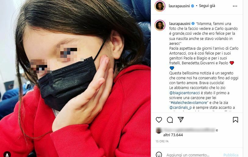 Tra i commenti anche quello di Laura Pausini, grande amica della coppia, che a poche ore dall’annuncio social ha condiviso con i follower la gioia della nascita del piccolo Carlo e la reazione di sua figlia Paola. “Mamma, fammi una foto che la faccio vedere a Carlo quando é grande, così vede che ero felice per la sua nascita anche se stavo volando in aereo!” ha esordito la cantante nel post che riporta il tenero gesto della bambina, ritratta felice a corredo del pensiero per i neogenitori: “Paola aspettava da giorni l’arrivo di Carlo Antonacci, ora è così felice per i suoi genitori Paola e Biagio e per i suoi fratelli, Benedetta,Giovanni e Paolo”.
