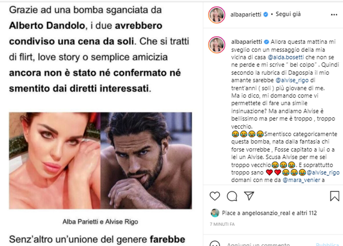 “Allora questa mattina mi sveglio con un messaggio della mia amica e vicina di casa Alda Bosetti che non se ne perde una e mi scrive -bel colpo-. Quindi secondo la rubrica di Dagospia il mio amante sarebbe di trent’anni ( soli ) più giovane di me”, queste le prime parole di Alba Parietti per smentire la notizia della storia d’amore con Alvise Rigo.