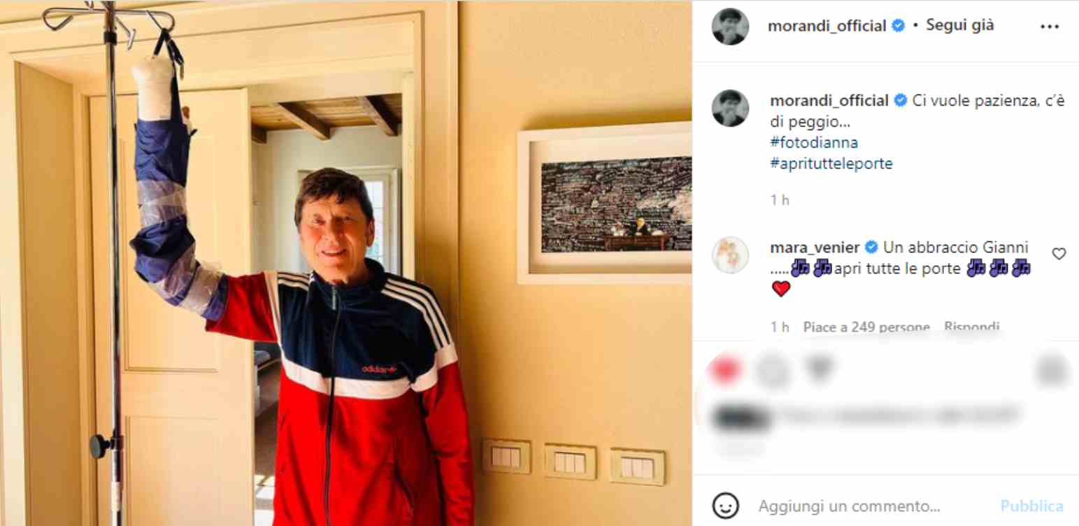 E’ già iconica la foto in tuta, con il braccio appeso in alto e su Twitter la scritta «per ora tutto bene. E chi lo ammazza, Gianni Morandi?” “Ci vuole pazienza, c’è di peggio” è stato il commento social del cantante ancora alle prese con le conseguenze delle ustioni riportate un anno fa. L’eterno ragazzo, che ha ottenuto il terzo posto in classifica al 72esimo Festival di Sanremo con il brano “Apri tutte le porte”.