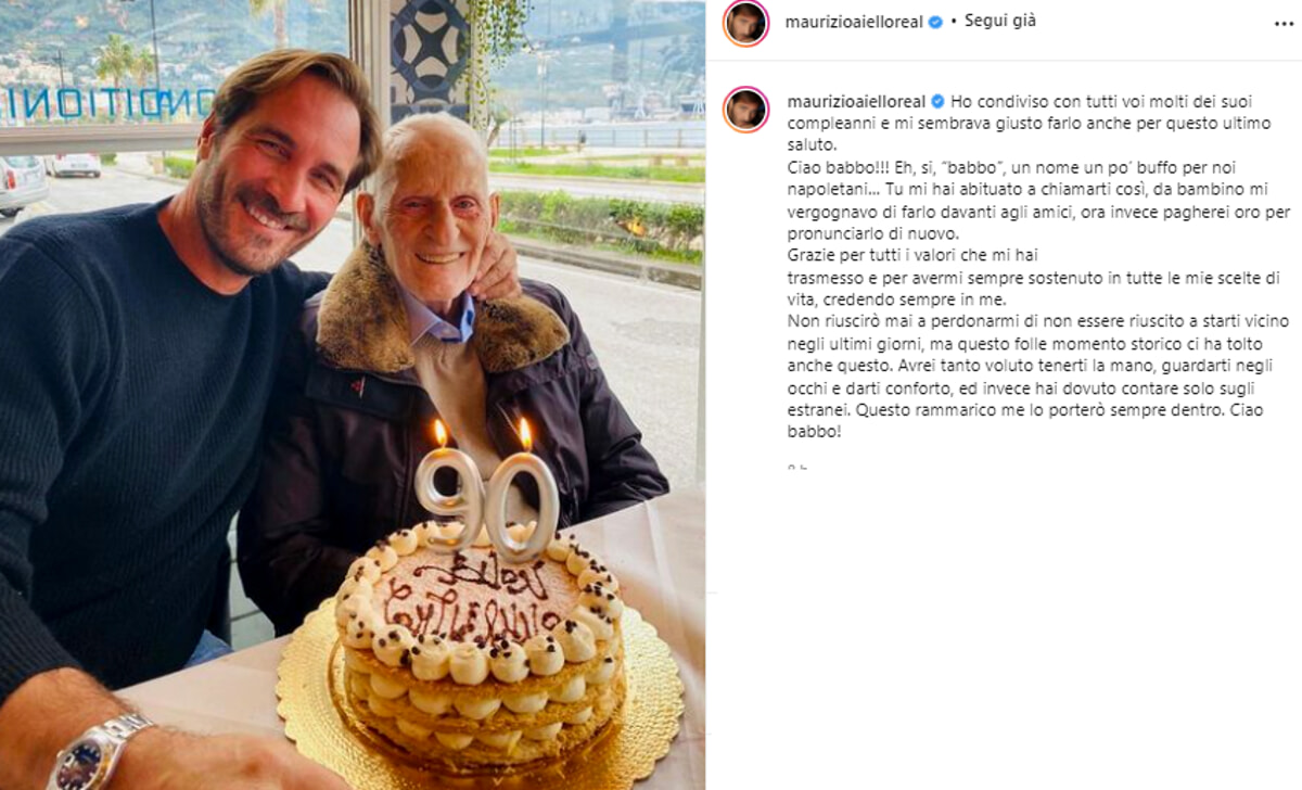 “Ciao babbo! – ha scritto Aiello su Instagram – Eh, si, “babbo”, un nome un po’ buffo per noi napoletani… Tu mi hai abituato a chiamarti così, da bambino mi vergognavo di farlo davanti agli amici, ora invece pagherei oro per pronunciarlo di nuovo. Grazie per tutti i valori che mi hai trasmesso e per avermi sempre sostenuto in tutte le mie scelte di vita, credendo sempre in me“.