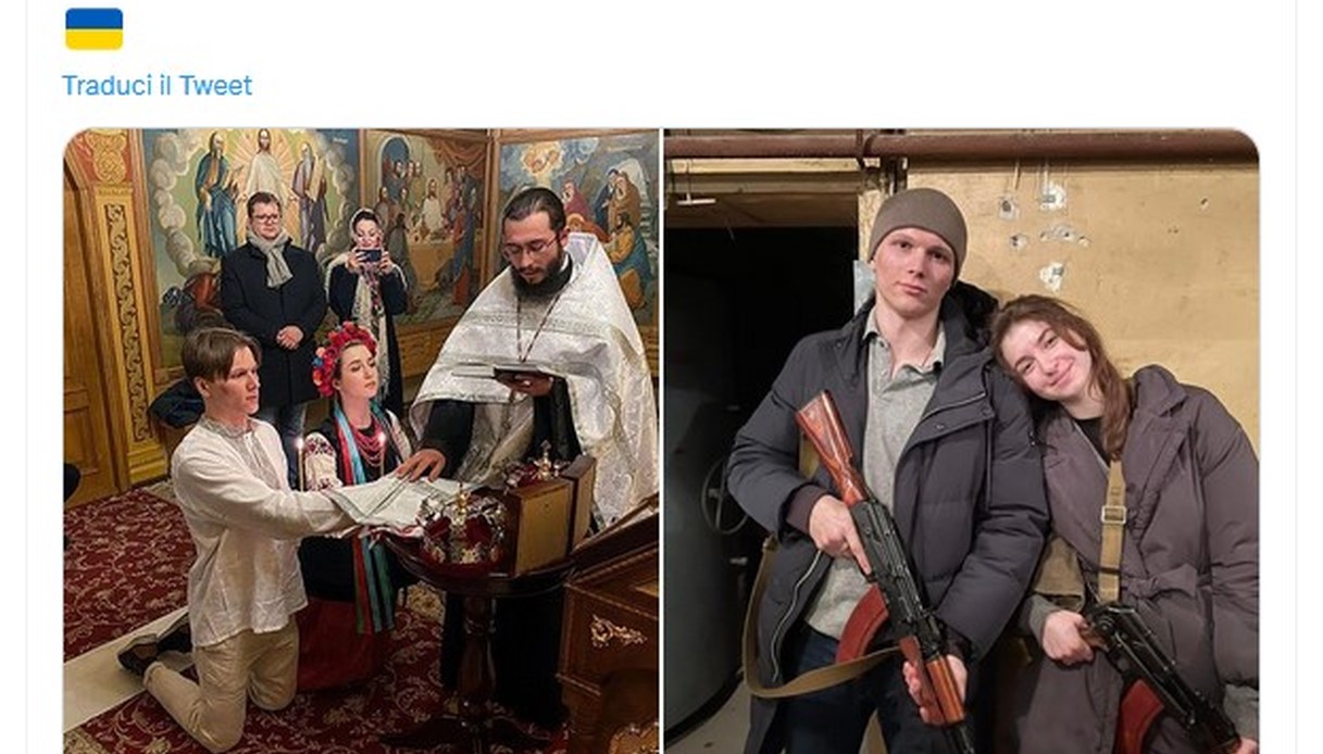 La 21enne Varyna Arieva e il 24enne Sviatoslav Fursin avevano già programmato la loro unione  nei mesi scorsi ma puntavano a sposarsi nel prossimo mese di maggio. Colti ala sprovvista dagli eventi tragici di queste ore come tanti altri ucraini hanno deciso di accelerare tutto per evitare che la guerra potesse fermare per sempre il loro progetto di unirsi in matrimonio.
